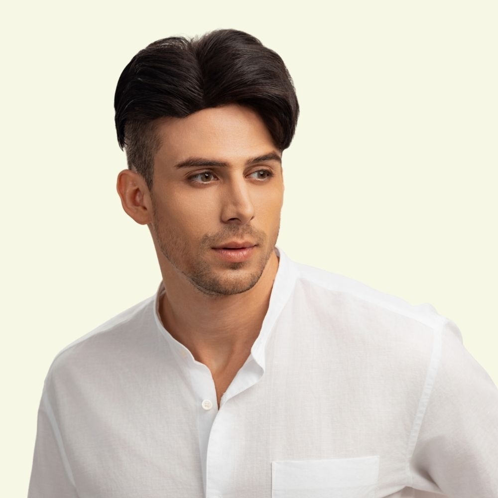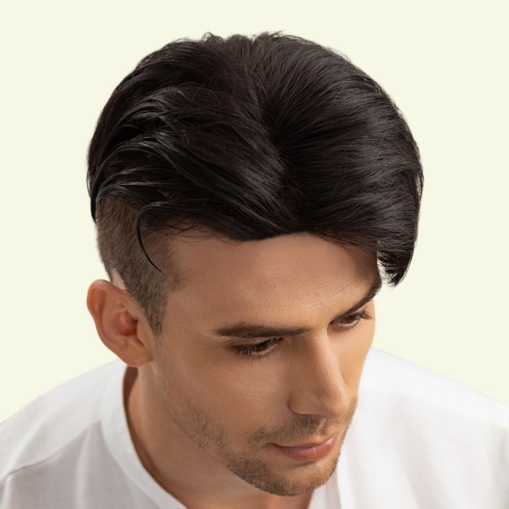 | Wigs Name | Men’s Top Hair System – 3D Ultra-Thin Skin, Side Part Slicked Down, Dark Brown |