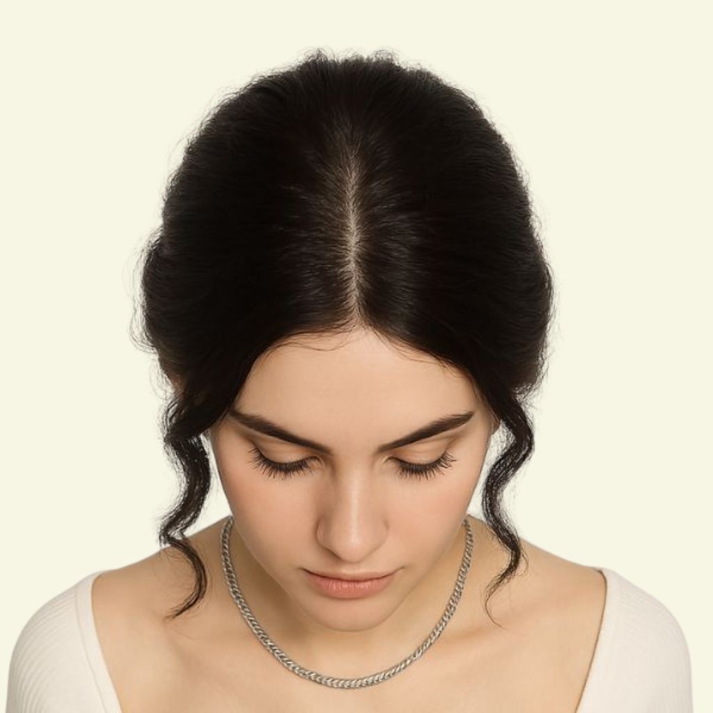 107025. Women’s Top Hairpiece – Bald Crown Bangs, Human Hair, 3D Ultra-Thin Skin, Size 5x8cm