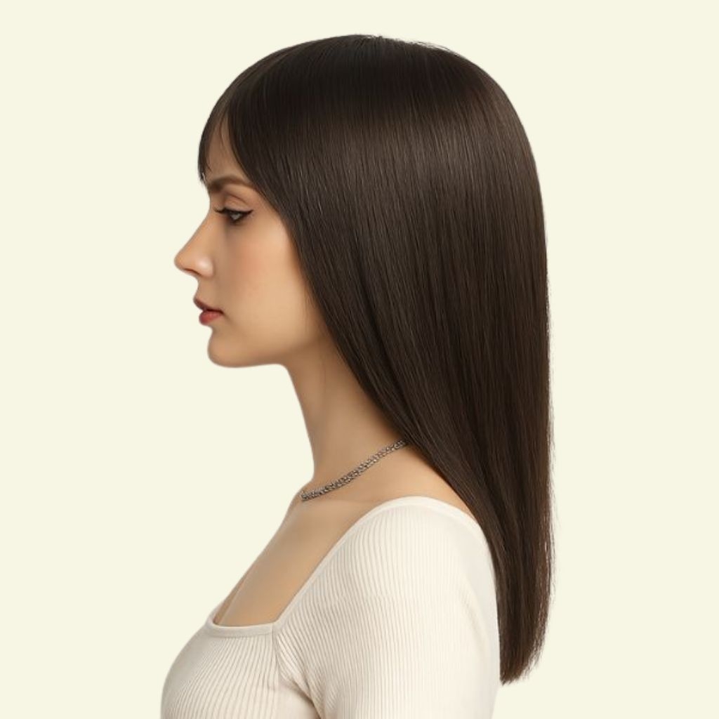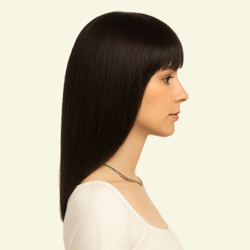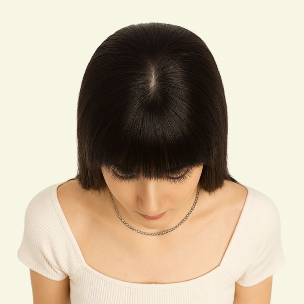 | Wigs Name | Women’s Top Hairpiece – 3D Ultra-Thin Skin, Wispy Bangs, Size 15x15cm |
