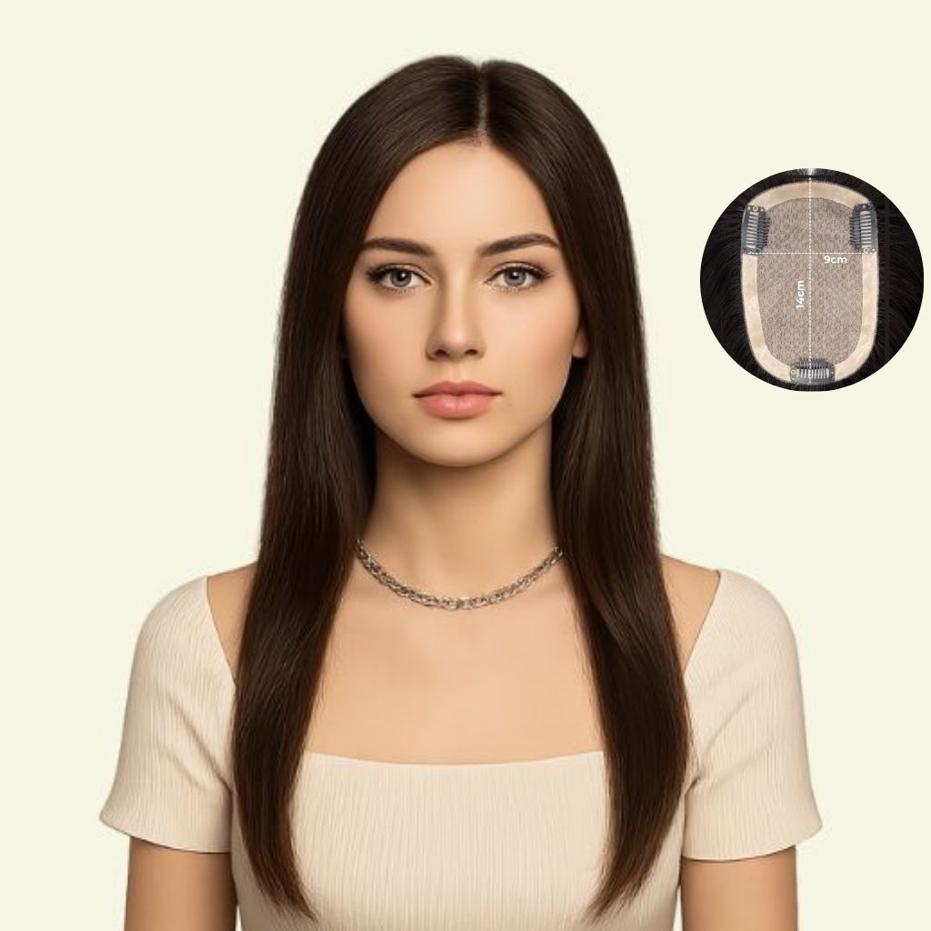 107025. Women’s Top Hairpiece – Bald Crown Bangs, Human Hair, 3D Ultra-Thin Skin, Size 5x8cm
